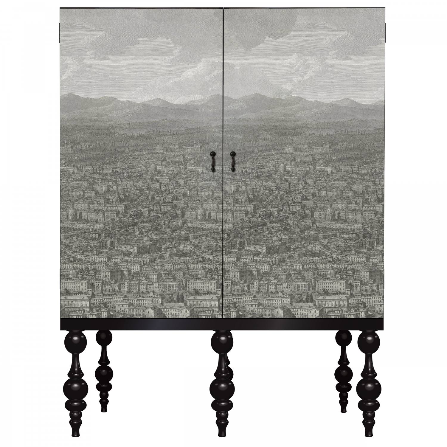 Eternally Rome Wideboy Cabinet in sepia is a work of art crafted on six shapely, turned legs. The wide format two door cabinet is wrapped with our luxurious wallpaper featuring an engaging, engraved wallpaper embracing the romance and antiquity of the Eternal City.Our delightful wallpaper wraps around three sides of the wideboy. Nestling beneath billowing clouds and protected by the seven hills, Rome's sprawling city tinted an exquisite, sepia shade, undulates to the tune of its fascinating history; its thousand churches, endless streets and alleyways, monuments and palaces.