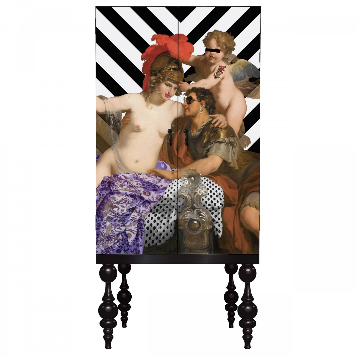 Our exotic Punk'd Passion design wraps around three sides of the tallboy. Pierced, pert and pouting, Calypso is most definitely calling the shots here. Bedecked with a Bollywood nose ring and pierced nipple, one ornate door handle is cheekily placed over her left breast emulating a nipple tassel. Odysseus, in Aviators, completely yields to her power and beauty while a tattooed cherub fans the flames of ardour. The classical imagery is set against a strikingly contemporary backdrop of chevrons pointing towards the loved up trio.