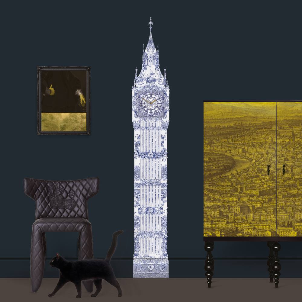 The Big Ben clock tower (now officially referred to as the Elizabeth Tower) is a classic icon of time; and Staffordshire Big Ben is a contemporary twist on our neo-gothic time keeping original black masterpiece. Intricately decorated with the traditional Staffordshire blue used on pottery from the 18th century, a glorious mix of Chinoiserie fused with English patternwork, and finished with an antiqued, crackle glaze finish.The tower is a single wall sticker measuring 2 metres tall, with all windows cut out to allow your wall colour to show through. The working clock face is made from powder coated steel with a printed dial and features gold metal hands with an ultra quiet 'ticking' quartz movement. Easily attached to the wall, no drilling is required. We even include the battery!