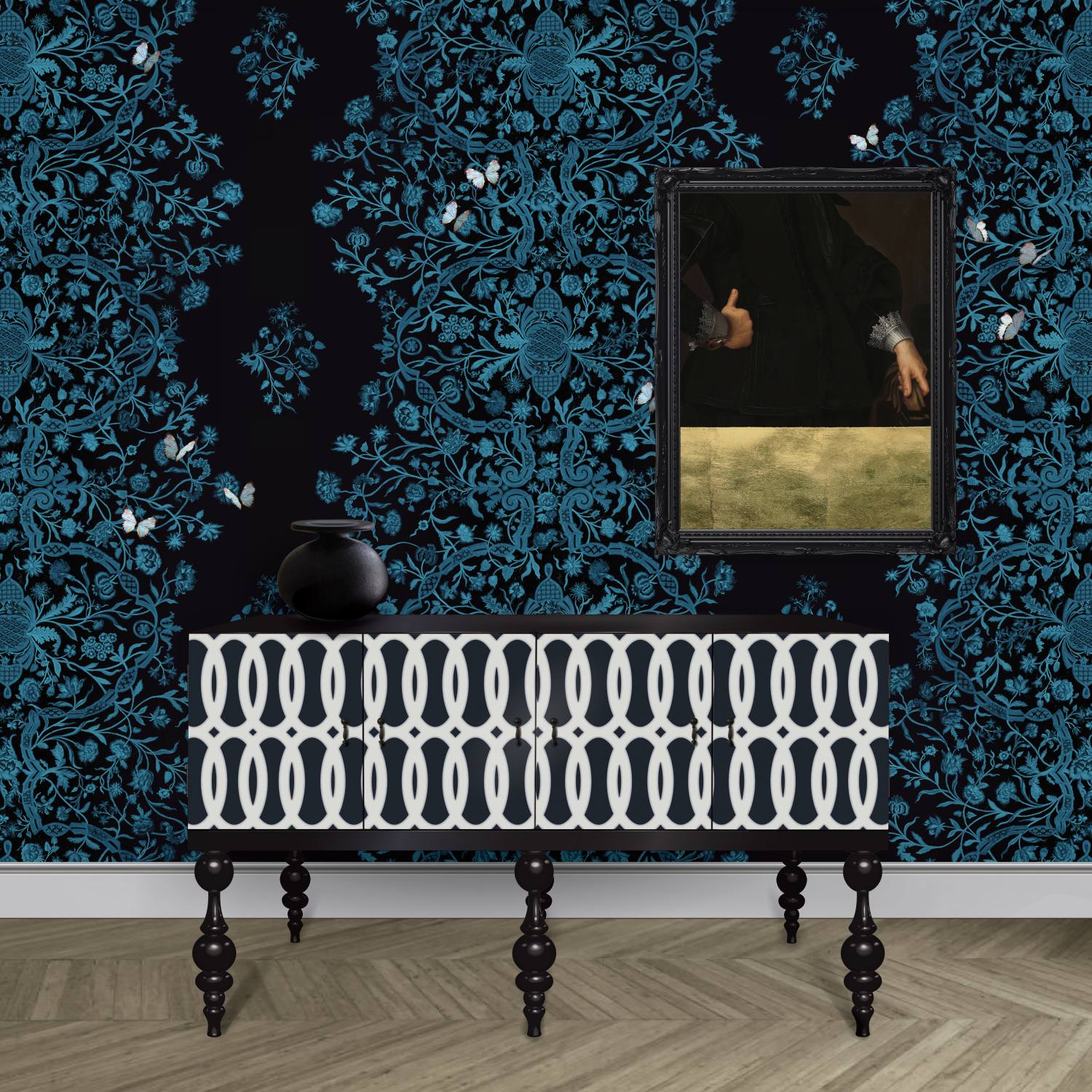 This spectacular Floramentation large scale wallpaper, featuring dianthus, auriculas and turk’s cap lilies set amongst trailing foliage and antique embroidery, is electrifying. Floramentation Cerulean Blue radiates deep, dramatic blues with lustrous accents of turquoise amidst a flurry of ethereal, iridescent butterflies set upon delicately textured paper. Magnificently opulent, in scale and luxurious pattern, this divine wallcovering lights up a room.The wallpaper is supplied in single rolls containing x4 drops to be fitted in sequence and half rolls containing x2 drops.