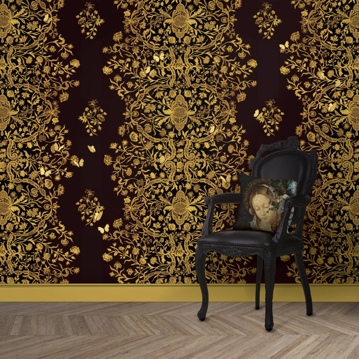 This spectacular Floramentation Golden Yellow large scale wallpaper, featuring dianthus, auriculas and turk’s cap lilies set amongst trailing foliage and antique embroidery, is stunning. Floramentation Golden Yellow radiates glorious, golden yellows with lustrous accents of amber upon a deep noir ground amidst a flurry of ethereal, iridescent butterflies on a luxuriously textured paper. Magnificently opulent, in scale and sublime pattern, this divine wallcovering lights up a room.The wallpaper is supplied in single rolls containing x4 drops to be fitted in sequence and half rolls containing x2 drops.