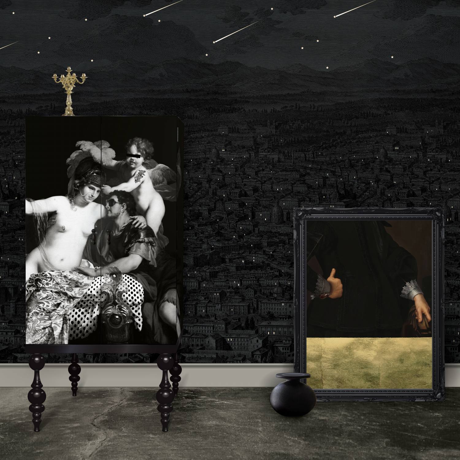 Nocturnally Rome, is an engaging, engraved wallpaper embracing the romance and antiquity of the Eternal City. Nestling beneath star-filled heavens, billowing clouds and shooting stars, Rome's sprawling city with windows illuminated, is protected by the seven hills. Steeped in myth and legend, the vista undulates to the tune of its fascinating history, its thousand churches, endless streets and alleyways, monuments and palaces.The landscape and architecture in this design, tinted an exquisite shade of midnight black, has been composed to continue ad infinitum allowing you to create the breathtaking vista of Nocturnally Rome whatever the size of your walls.