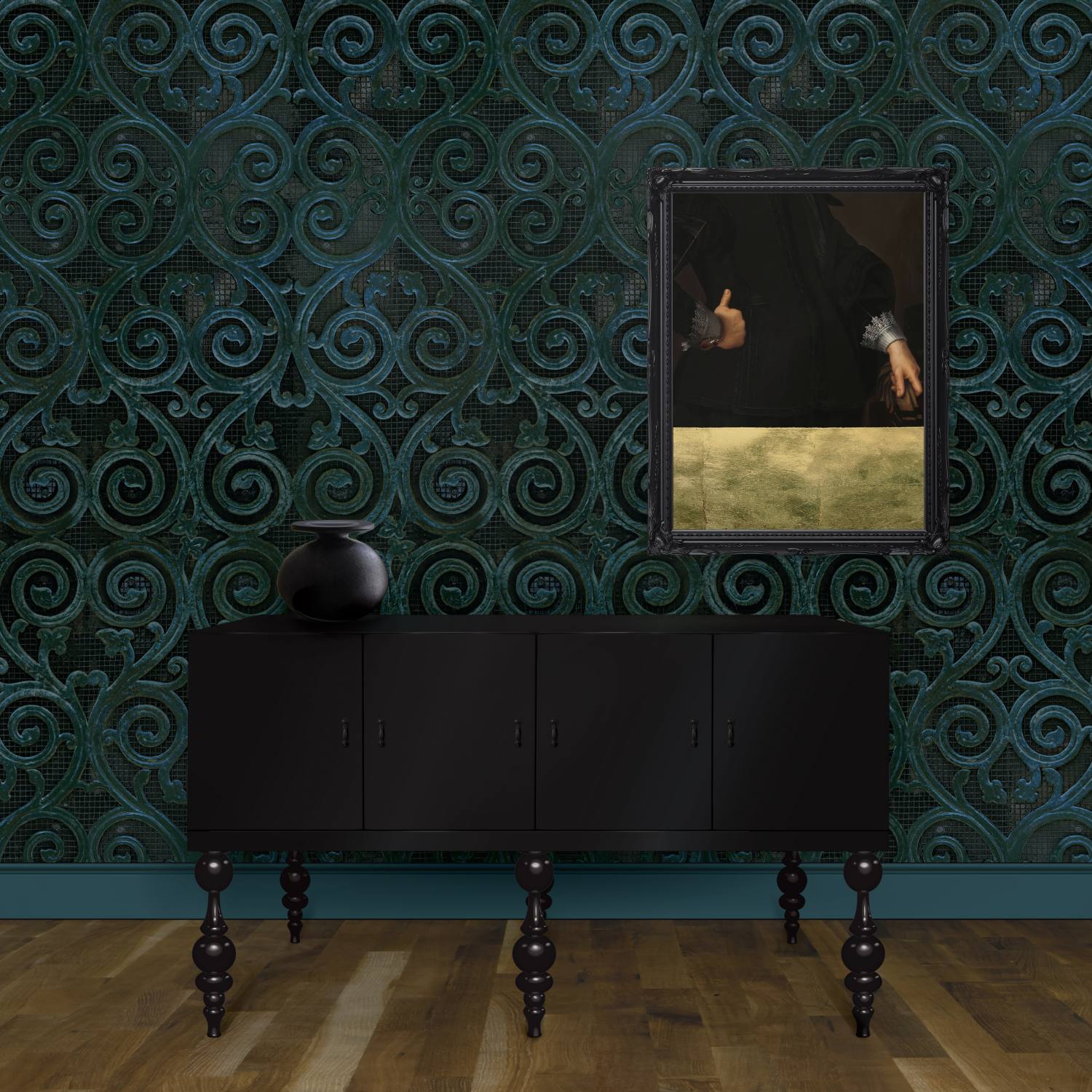 St Cross wallpaper in Jade Black was inspired by the ornate Gothic ironwork on one of the gates at St Cross College located on Oxford's famous St Giles'. Sitting in front of an ancient oak door, the scrollwork, sublime in its flaking grandeur is backed with industrial wire mesh, crudely positioned and screwed in place. What is so intriguing is how incongruously beautiful the two look together; the ornate melding with the industrial in a perfectly imperfect harmony.There is a real three-dimensional depth to this pattern and a subtle palette of colour, with the jade and black yielding to delicate touches of brown, blue and darkest green.